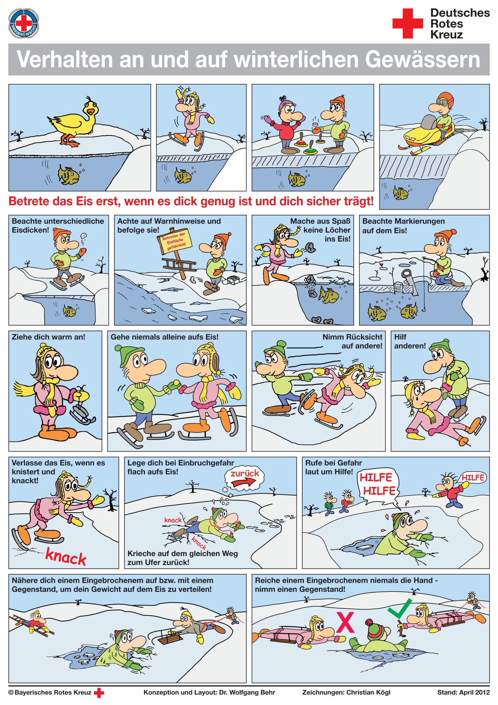 Ein kalter Winter: Teiche, Seen und kleine Flüsse verwandeln sich in wunderschöne Eisflächen. Doch es ist Vorsicht geboten. Strömungen unter dem Eis, Temperaturunterschiede und verschiedene andere Faktoren können dafür sorgen, dass das Eis nicht überall gleich dick ist und vielleicht keinen Menschen tragen kann. Erst wenn das Eis überall 15cm dick ist, trägt es sicher eine Person. Bricht doch jemand ins Eis ein, heißt es schnell sein. Im kalten Wasser schwinden ruckzuck die Kräfte. Umsichtiges Handeln und ein sofortiger Notruf sind dann überlebenswichtig. Wer sich nicht sicher ist, ob das Eis wirklich trägt, geht am Besten in die Eishalle oder auf öffentliche Eisflächen.